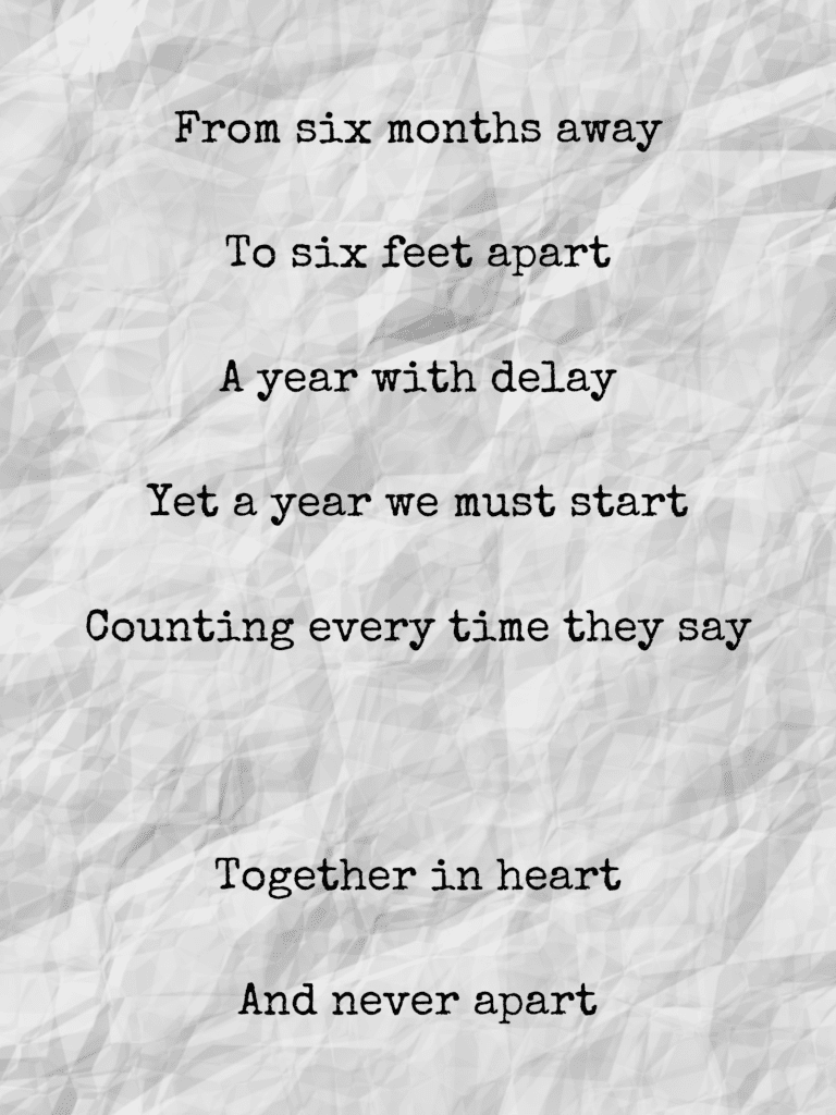 From-six-months-away-To-six-feet-apart-A-year-with-delay-Yet-a-year-we-must-start-Counting-every-time-they-say-Together-in-heart-And-never-apart